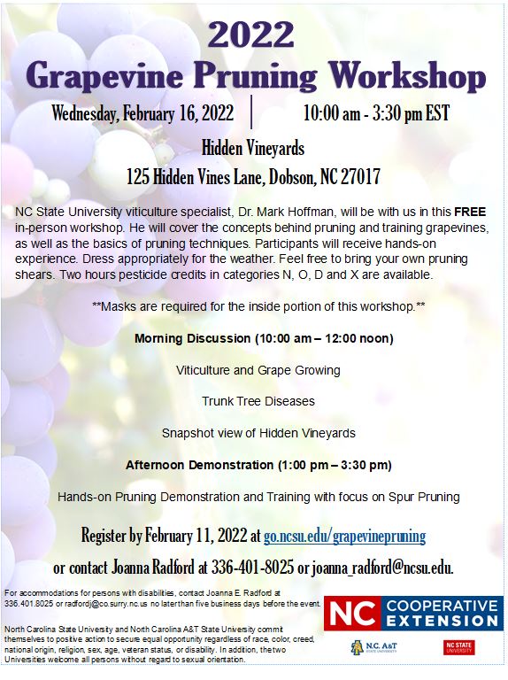 Due to forecasted weather conditions for Friday, January 21, 2022, the "GRAPEVINE PRUNING WORKSHOP" has been postponed and rescheduled for Wednesday, February 16, 2022. All other details will remain the same. We will start at 10 am with classroom instruction and break for lunch at 12 noon. Hands-on pruning instruction will begin at 1 pm in the vineyard. We will be at Hidden Vineyard. The address is 125 Hidden Vines Lane, Dobson, NC 27017.