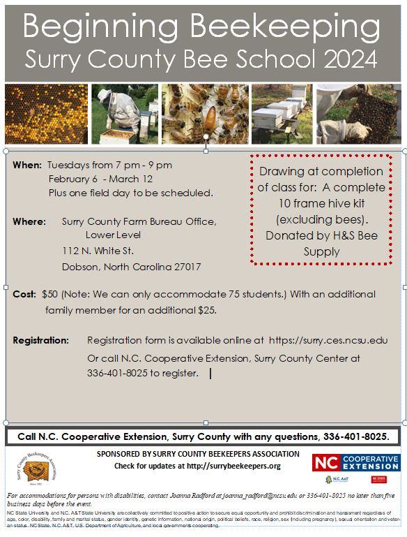 The Surry County 2024 Bee School sponsored by the Surry County Beekeepers Association will beheld on Tuesdays from 7pm to 9pm starting February 6, 2024 through March 12, 2024. The classes will be held in the lower level of the Surry County Farm Bureau Office in Dobson, NC. The cost of the class series is $50 and an additional family member can be added for an additional $25. Registration is recommended, and the registration form is found below. If you have questions, please feel free to call our office at 336-401-8025.