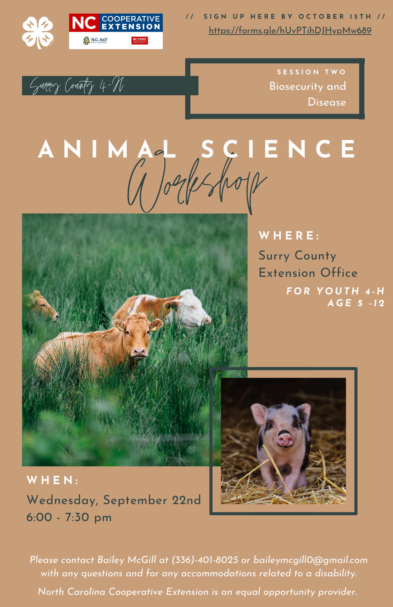 This program is for youth 4-H age 5-12 and youth must be enrolled in 4-H Online. Topics we will learn about are disease and biosecurity! This workshop will be held Wednesday, October 27, 2021, from 6–7:30 p.m. at the N.C. Cooperative Extension of Surry County office. If you would like to attend, please complete the Google Form by October 15. If you have any questions, feel free to reach out to Bailey McGill at bailey_mcgill@ncsu.edu.